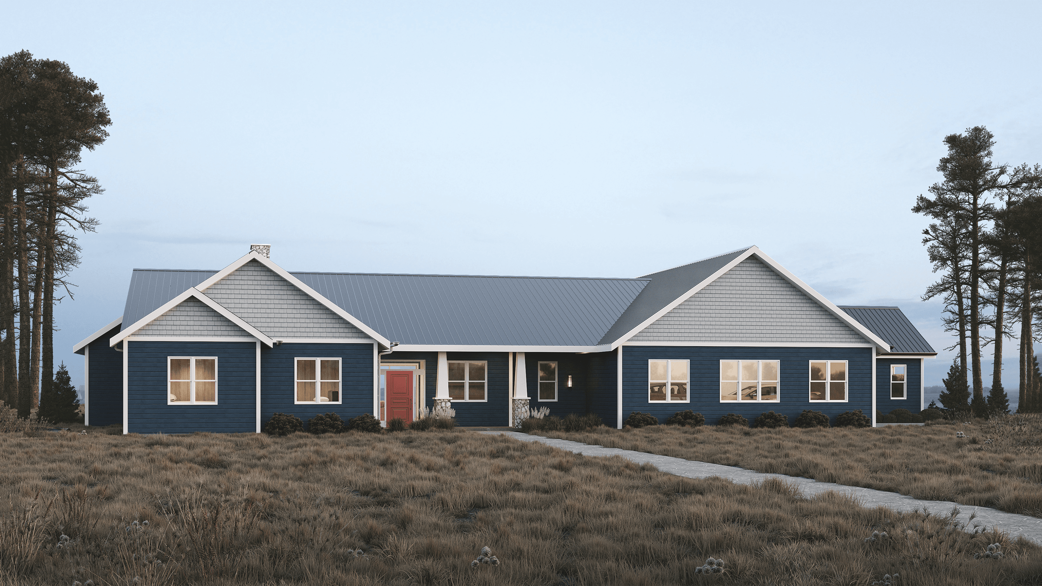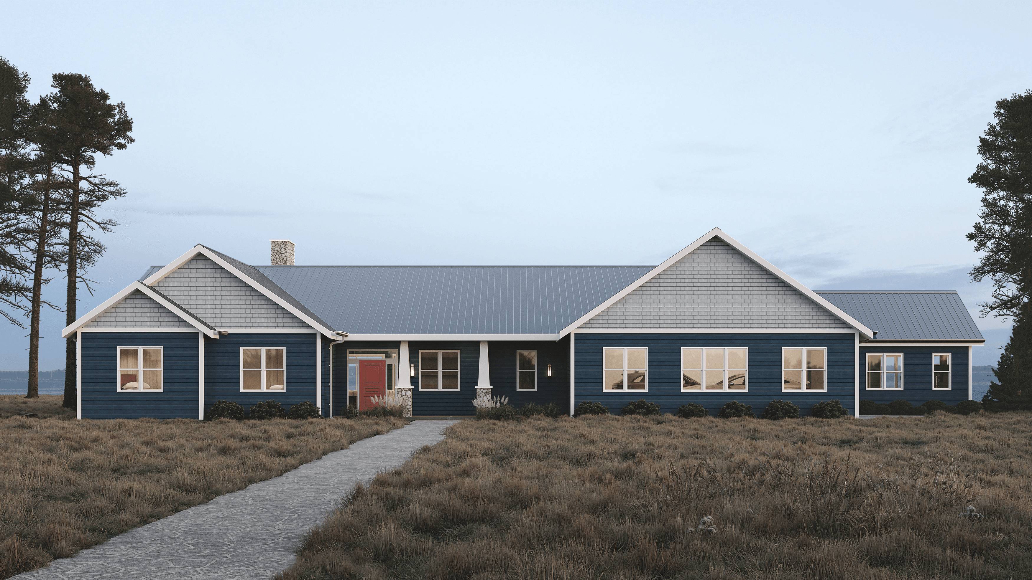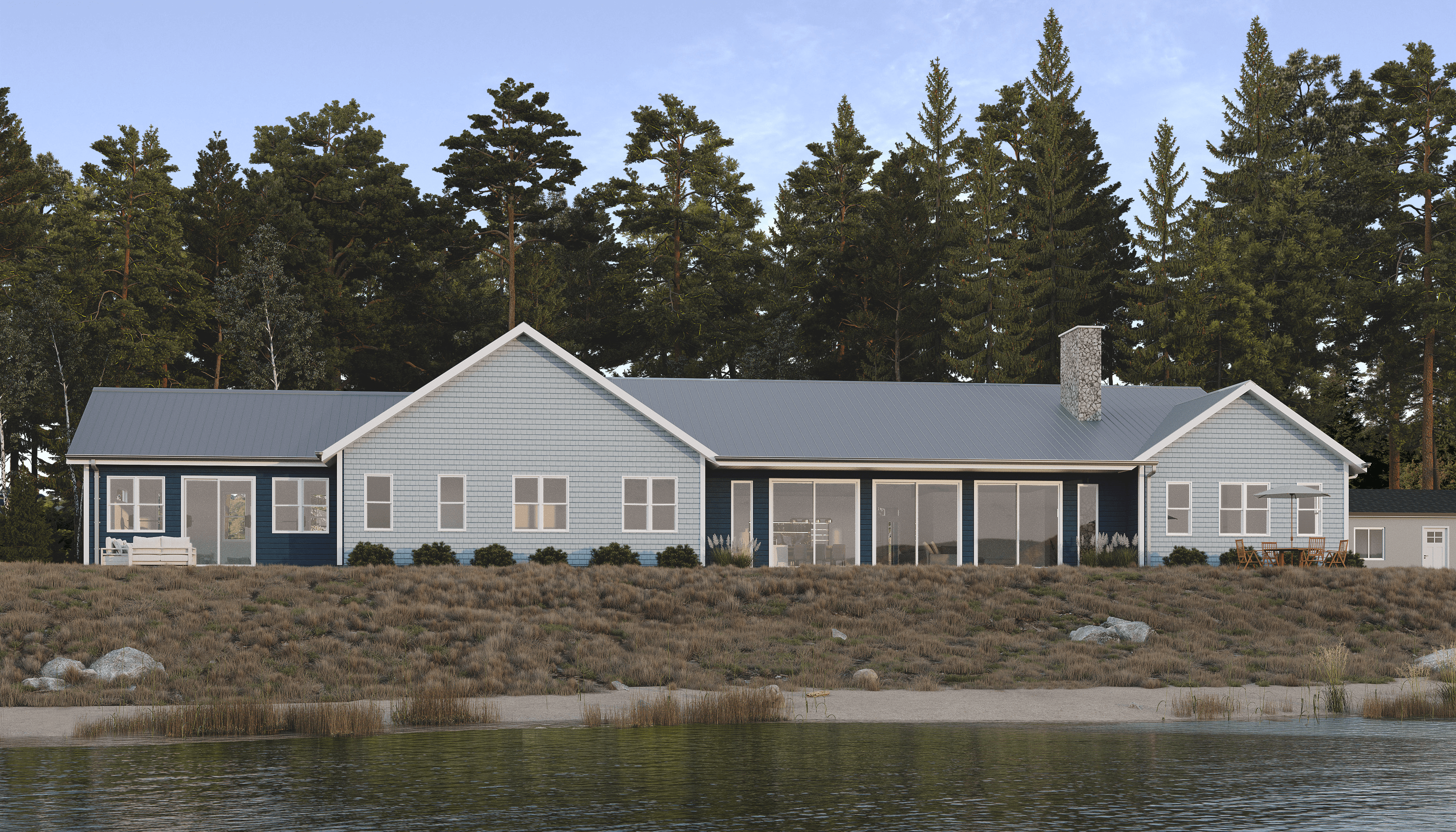 To build a home where the key spaces have beautiful views of the lake. Including the gym, master bedroom, living room, and their office. Their wish list also included a fireplace for the living room and a versatile, bonus room in the house.